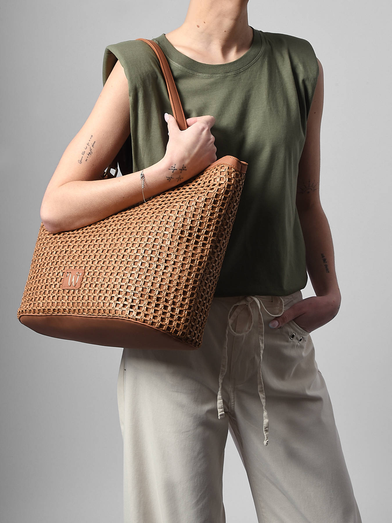 De schoudertas WOOMEN uit de lijn Neflier Estival combineert elegantie, praktisch gebruik en zomerse stijl. Het hoofdmateriaal van polypropyleen met gerecycled polyurethaan, samen met de voering van katoen en linnen, biedt lichtheid en stevigheid. De verfijnde afwerking en het pareldetail op de ritssluiting geven het model originaliteit en raffinement. Deze bimateriële tas beschikt over een ritssluiting en het gouden resinelogo, waardoor hij een elegant en functioneel accessoire is, ideaal om al je zomerse outfits compleet te maken.